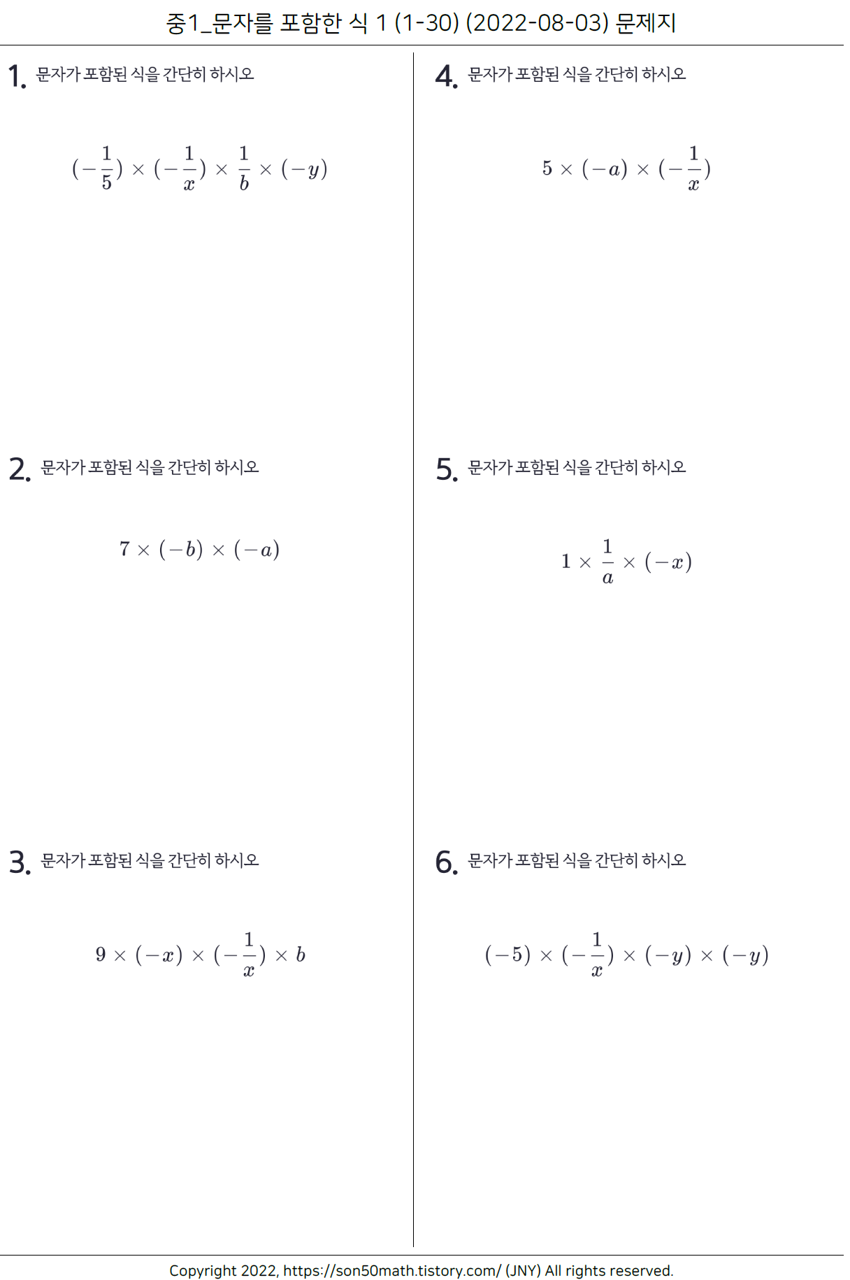 | [중학교 1학년 수학] 문자를 포함한 식 2 (나눗셈포함) (0) | 2022.08.03 |