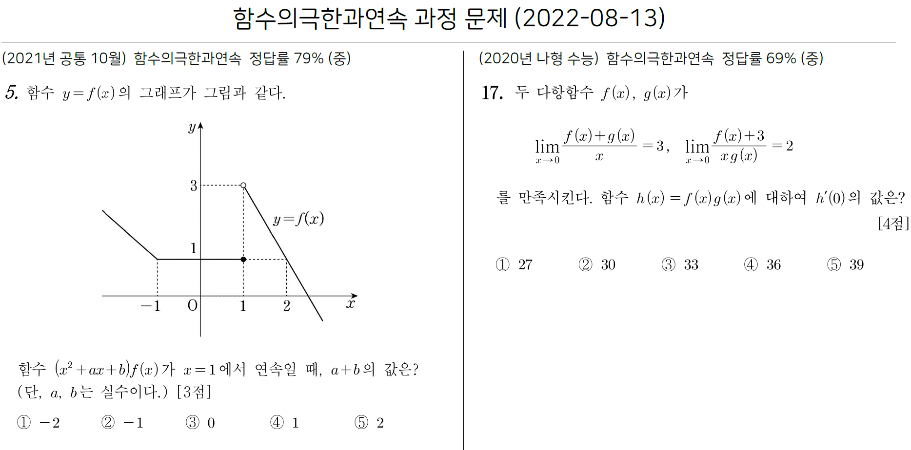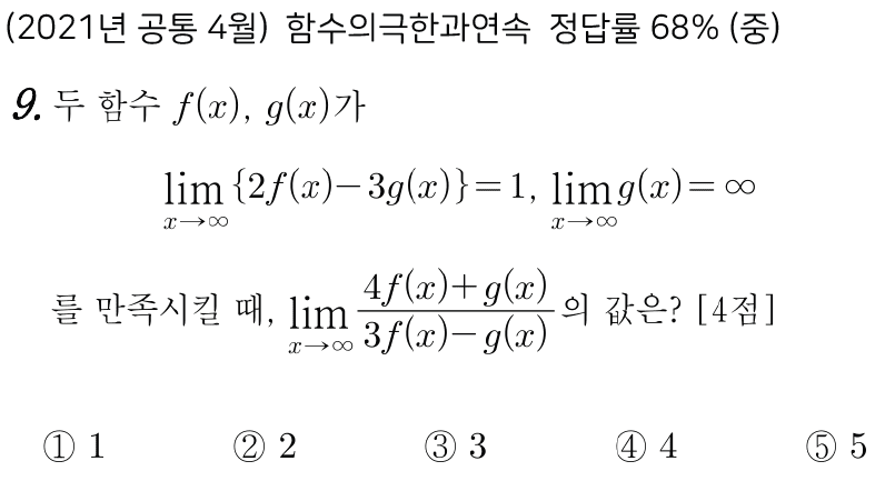일반적으로 함수의 극한 값을 구하는 문제는 쉽지만, 함수의 극한과 연속을 응용하여 함수를 구하는 문제들이 난이도가 높으므로 유사 문제를 반복해서 연습하시길 추천드립니다.