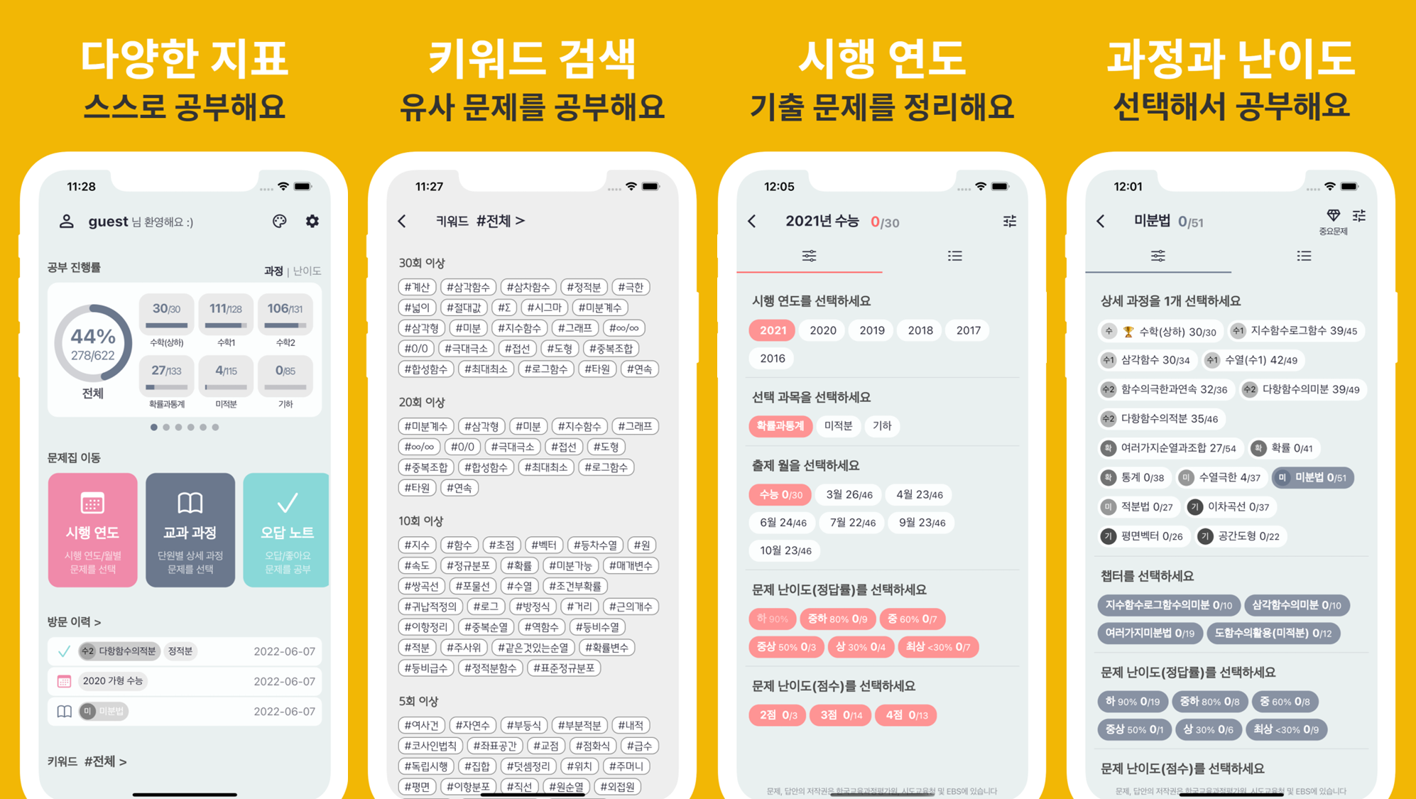 메인 화면에는 다양한 지표로 문제 풀이 진도를 표시해주며, 과정별 (수학 상하, 수학1, 수학2, 확률과 통계, 미적분, 기하)과 난이도별 (하, 중, 중상, 상, 최상)로 구분되어 있어 실력을 체크 할 수 있습니다. 또한 키워드와 시행 연도, 상세 과정 별로 문제가 정리되어 있어 필요한 문제를 선택하고 찾아서 공부할 수 있습니다.