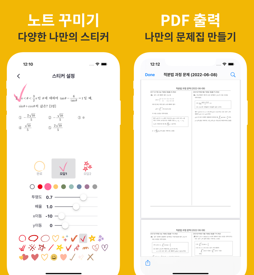또한, 다양한 스티커로 오답 노트를 꾸밀 수 있으며, 문제를 선택하여 PDF로 출력할 수 있어서 문제들을 인쇄하거나 필기앱으로도 공부할 수 있습니다.